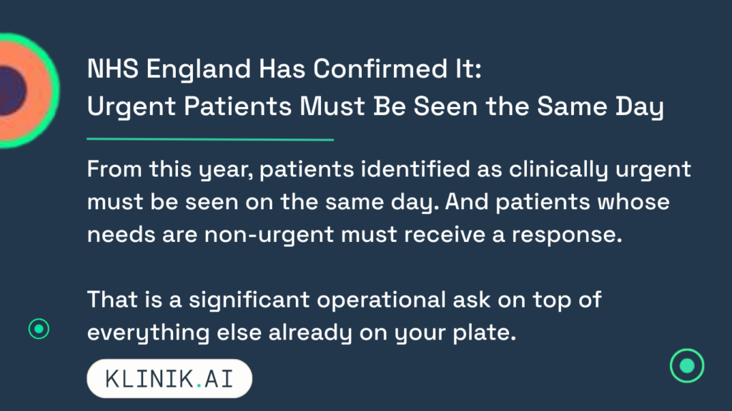 Blog & News Book a demo News NHS England Has Confirmed It: Urgent Patients Must Be Seen the Same Day March 6, 2026 Lees meer Why Total Triage has become the main story February 10, 2026 Lees meer AI vs. Rules-Based Forms: Why “Smart” Triage Matters for Safety January 28, 2026 Lees meer The Healthcare Air Traffic Controller: How AI is Unclogging Primary Care January 23, 2026 Lees meer Page1 Page2 Page3 Page4 Page5 Page6 Page7 Page8 Page9 Page10 Page11 Page12 Page13 Page14 Page15 Page16 Page17